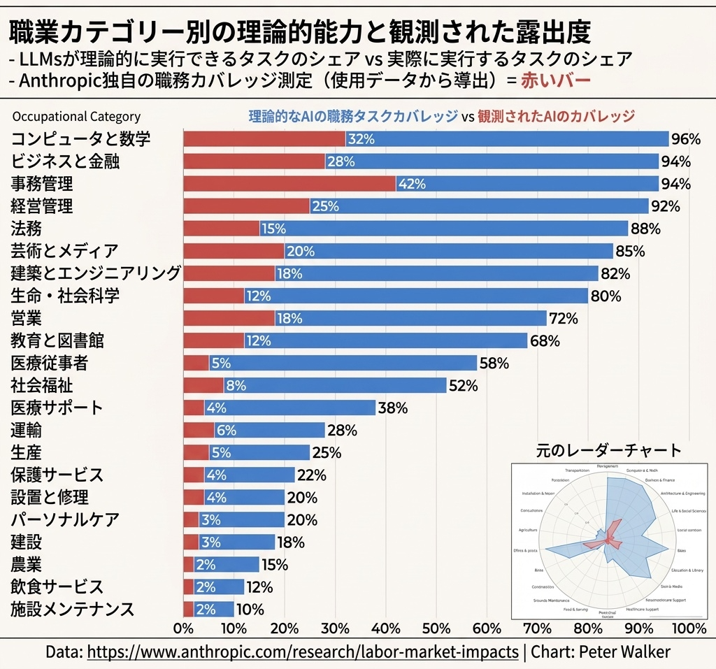 コンピューター・数学系の職種では、AIが理論上94%のタスクをこなせる状態にあります。現在の実際の使用率は33%にとどまっていますが、研究者たちはこのギャップが埋まっていくのは時間の問題だと見ています。
