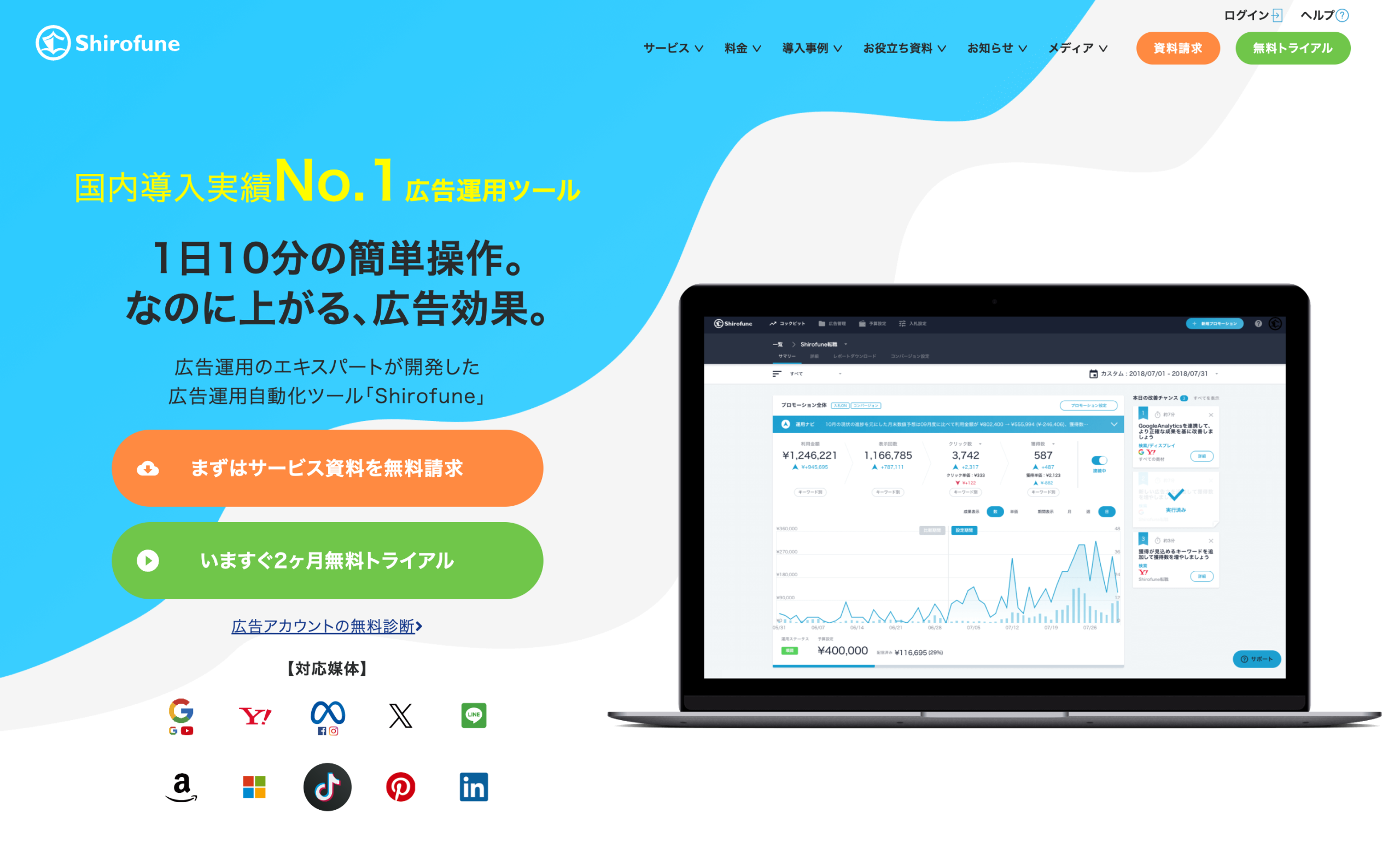 Shirofuneは国内広告運用自動化ツールの市場シェア9割超を持つサービスで、Google・Yahoo!・Meta・LINE・TikTok・Amazon広告など10媒体以上に対応しています。「1日10分でプロ品質の広告運用」を謳い、月間作業時間を最大92%削減しつつCV数を改善した実績もある。13,000アカウント以上が利用しており、大手広告代理店でも基幹システムとして採用されています。(出典:Shirofune公式サイト